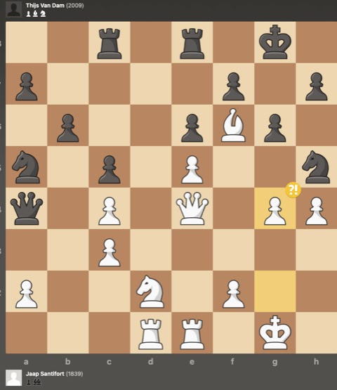 Voor de bekercompetitie was een afspraak gemaakt om deze avond te gebruiken om de loting te spelen. Dat ging tussen Jaap Santifort en Thijs van Dam, waarbij Jaap het commentaar levert: Vooraf was Thijs favoriet, vanwege het ratingverschil van ruim 250 punten. Maar omdat er een verschil in bedenktijd was van bijna een half uur in het nadeel van Thijs, zou het toch een redelijk eerlijke strijd worden. De 1e partij had Jaap wit en er kwam een Nimzo-Indische stelling op het bord. Thijs concentreerde zich op de damevleugel terwijl Jaap zijn heil zocht in het centrum en op de koningsvleugel. Het werd een mooie pot, met kansen voor Jaap. Zie het eerste diagram, met een