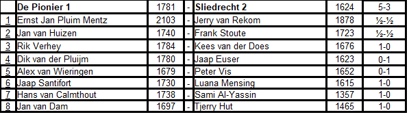 Eerst dan dus bezig met de wedstrijd. De eerste uitslag kwam tot stand aan bord 2, waar Jan van Huizen naar het leek een niet al te moeilijke avond had. Ook zijn tegenstander niet, wat dan meestal remise gaat betekenen. Zo ook in dit geval, zodat er relatief snel ½-½ op het scorebord (links boven aan de muur) kwam te staan. Ook het vervolg liet hierna niet lang op zich wachten, aangebracht aan de borden 5 en 8. Daar speelden voor De Pionier 1 invaller Alex van Wieringen (5, invaller voor Thijs van Dam, die net in een belangrijke fase van zijn opleiding zit en daarom verstek moest laten gaan voor deze wedstrijd) en teamleider Jan van Dam (inderdaad, de vader van). Wie van beiden het eerst klaar was is moeilijk aan te geven, maar Alex was blijkbaar te voorzichtig en liet daarmee de kansen aan zijn tegenstander, wat dus uiteindelijk verlies voor hem betekende. Jan daarentegen had één van de beide spelers met de laagste rating getroffen, waarmee hij inderdaad relatief snel korte metten maakte. Zodoende was de tussenstand rond de klok van tienen mooi gelijk: 1½-1½. De andere spelers zorgden er verder voor dat de wedstrijd redelijk normaal lang duurde en je zult dan in die kleine uurtjes nog helemaal naar Sliedrecht moeten!